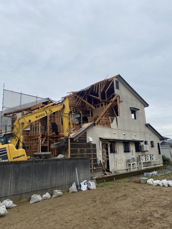 隣家と距離が10センチ程の狭小住宅の為、二階部分は手壊し解体にて施工致しました。